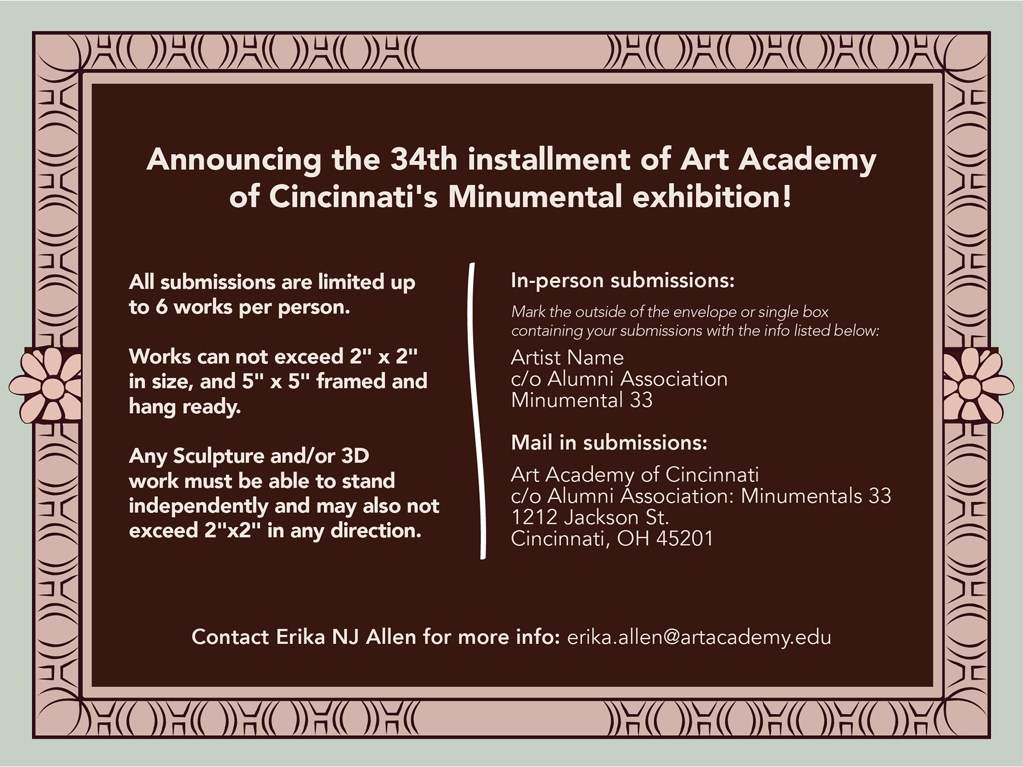 Please join us to celebrate the 34th installment of Art Academy of Cincinnati’s Minumental exhibition, which features tiny artworks by AAC students, alumni, staff, and board members! The art sale and closing reception for the exhibition will take place on Friday, February 28, from 5—8pm. This is a pay-and-carry event, so you’ll be able to leave with any artwork you’ve purchased. Donated sale proceeds benefit the Alumni Scholarship Fund; so your purchases will help support our students!
